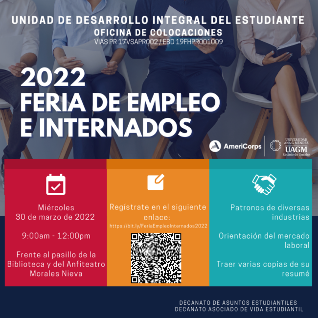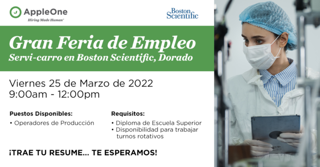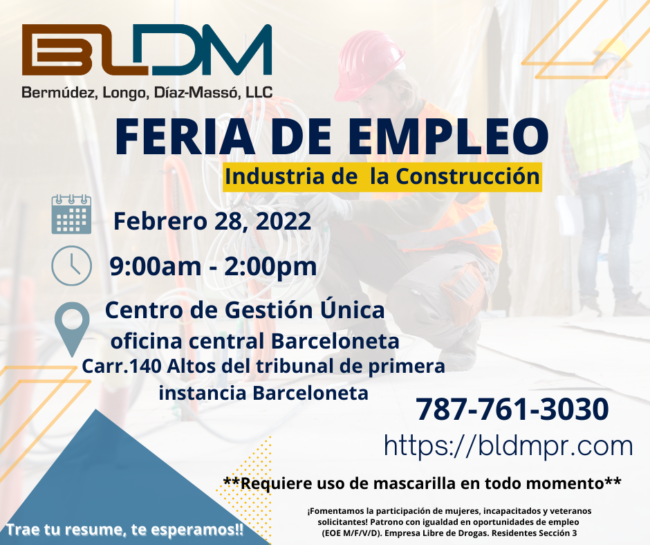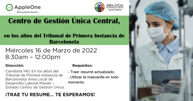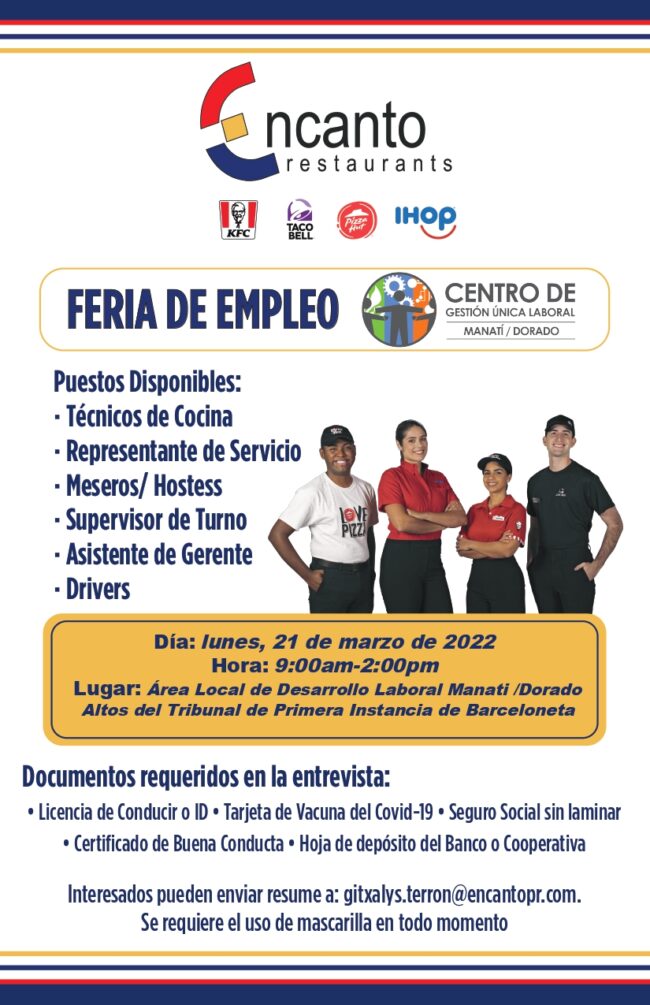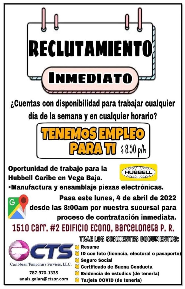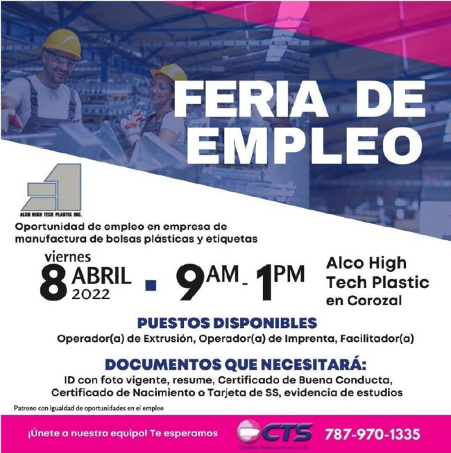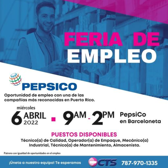 Feria de Empleo que se llevará a cabo este próximo 6 de abril de 2022 de 9:00 am a 2:00 pm en Pepsico en Barceloneta. Puestos Disponibles: Técnico de Mantenimiento Almacenista Para más información se puede comunicar al 787-970-1335 o ingresar al siguiente enlace: www.ctspr.com